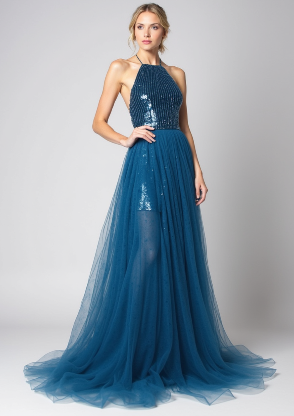 Cette belle robe a un détail délicat au niveau du cou et un dos nu séduisant. Le corsage extensible à paillettes épouse la silhouette avant de se terminer par une jupe en tulle de rêve qui permet beaucoup de mouvement. À porter avec une sandale stilleto.